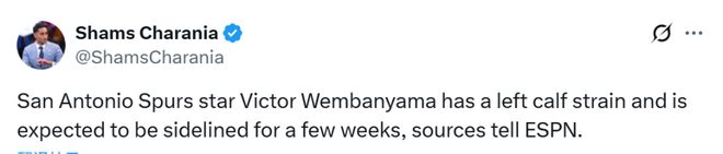 “联盟消息人士透露,马刺队将在两到三周后重新评估文班亚马的伤情,他至少会休战两周。鉴于近期有多起小腿伤势后续恶化的情况出现,马刺队此次处理格外谨慎。另外说句供参考的话,据称文班亚马本人感觉并无大碍。”